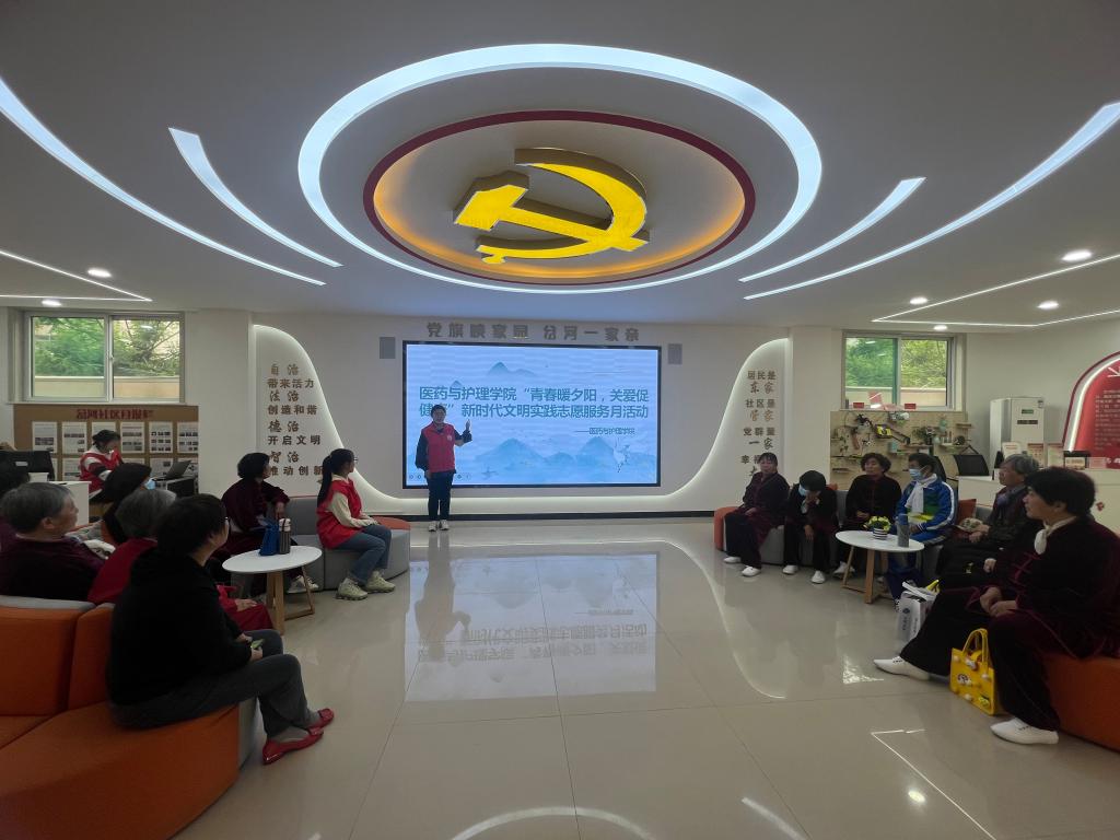 为深入学习宣传贯彻党的二十大精神,传承“五四”精神,进一步提高社区居民的健康观念,提升中老年人的健康保健意识,传播健康理念,倡导良好的生活方式。医药与护理学院员工党员、南丁格尔志愿服务队于5月9日在岔河社区开展“青春暖夕阳,关爱促健康”的知识讲座及教学八极拳活动。