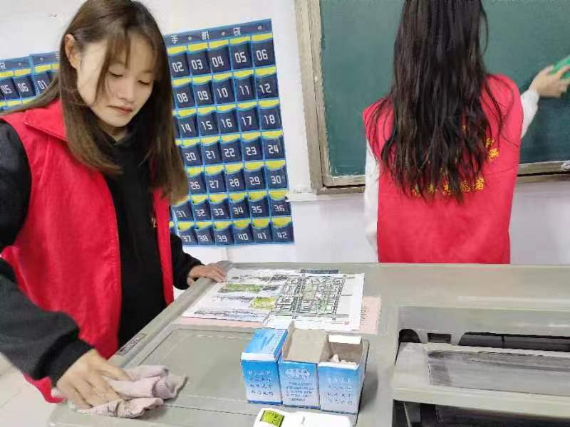 活动过程中,志愿者分工明确,对体育楼所属教室进行有序打扫,包括打扫地面卫生、打扫课桌卫生、整理讲台、清洁黑板、清洁门窗、整理窗帘、垃圾处理。