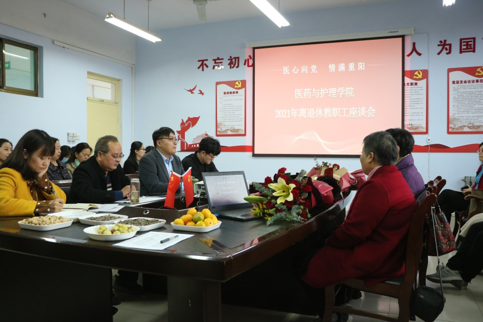 10月19日下午,医药与护理学院在体育楼509会议室举办“医心向党,情满重阳”离退休教职工座谈会。医药与护理学院全体教师、退休教师代表参加。